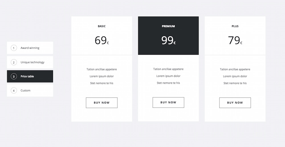 <div class="gkPage"> <div class="gk-price-table" data-cols="3"> <dl> <dt><strong>Basic</strong><span>69<sub>€</sub></span></dt> <dd> <ul> <li>Tation ancillae appetere</li> <li>Lorem ipsum dolor</li> <li>Stet nemore te his</li> </ul> </dd> <dd><a href="#">Buy now</a></dd> </dl> <dl class="gk-premium"> <dt><strong>Premium</strong><span>99<sub>€</sub></span></dt> <dd> <ul> <li>Tation ancillae appetere</li> <li>Lorem ipsum dolor</li> <li>Stet nemore te his</li> </ul> </dd> <dd><a href="#">Buy now</a></dd> </dl> <dl> <dt><strong>Plus</strong><span>79<sub>€</sub></span></dt> <dd> <ul> <li>Tation ancillae appetere</li> <li>Lorem ipsum dolor</li> <li>Stet nemore te his</li> </ul> </dd> <dd><a href="#">Buy now</a></dd> </dl> </div> </div>
