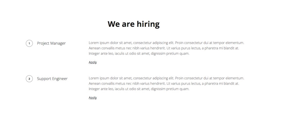 <dd data-sr="enter bottom and move 50px wait .7s"><p>Lorem ipsum dolor sit amet, consectetur adipiscing elit. Proin consectetur dui at tempor elementum. Aenean convallis metus nec nibh varius hendrerit. Ut varius purus lectus, a pharetra mi blandit at. Integer ante leo, iaculis ut odio sit amet, dignissim pretium quam.</p><a href="#">Apply</a></dd>